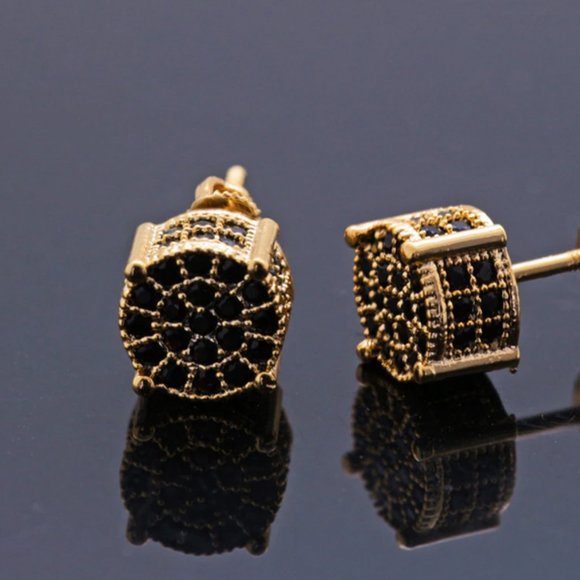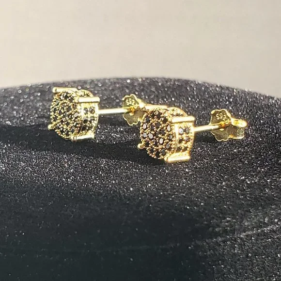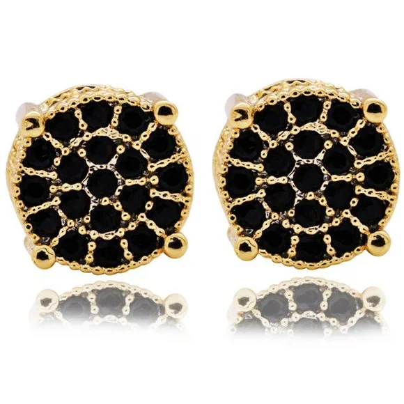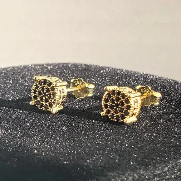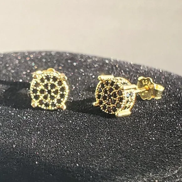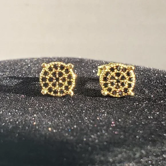 Crafted from 925 sterling silver and coated in rich yellow gold plating, each stud features a cluster of micro-set black cubic zirconia stones that shimmer with subtle elegance.