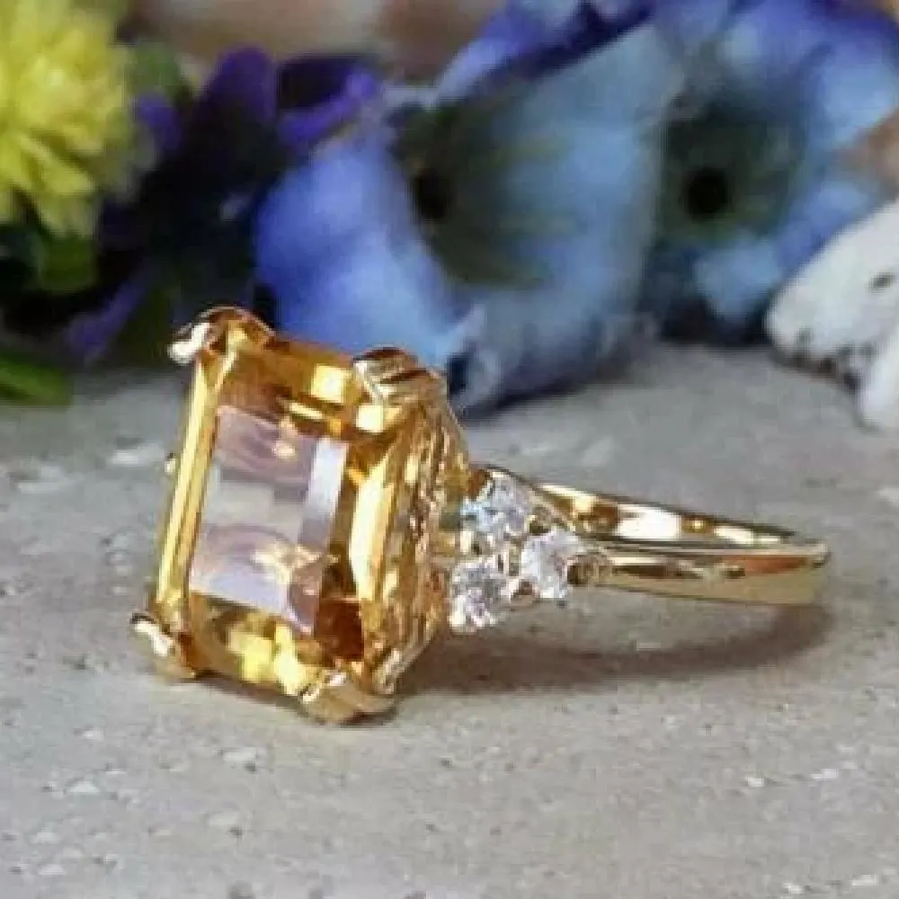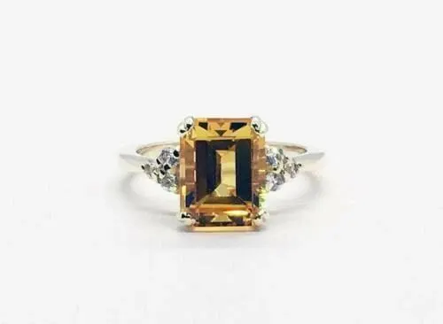This elegant gold-plated 925 sterling silver ring features a dazzling emerald-cut simulated yellow citrine, designed to resemble Citrine. The vibrant yellow stone is accented with sparkling round CZ side stones, creating a luxurious and timeless piece. Perfect as a cocktail ring, engagement ring, or anniversary gift, it adds a touch of brilliance to any look.