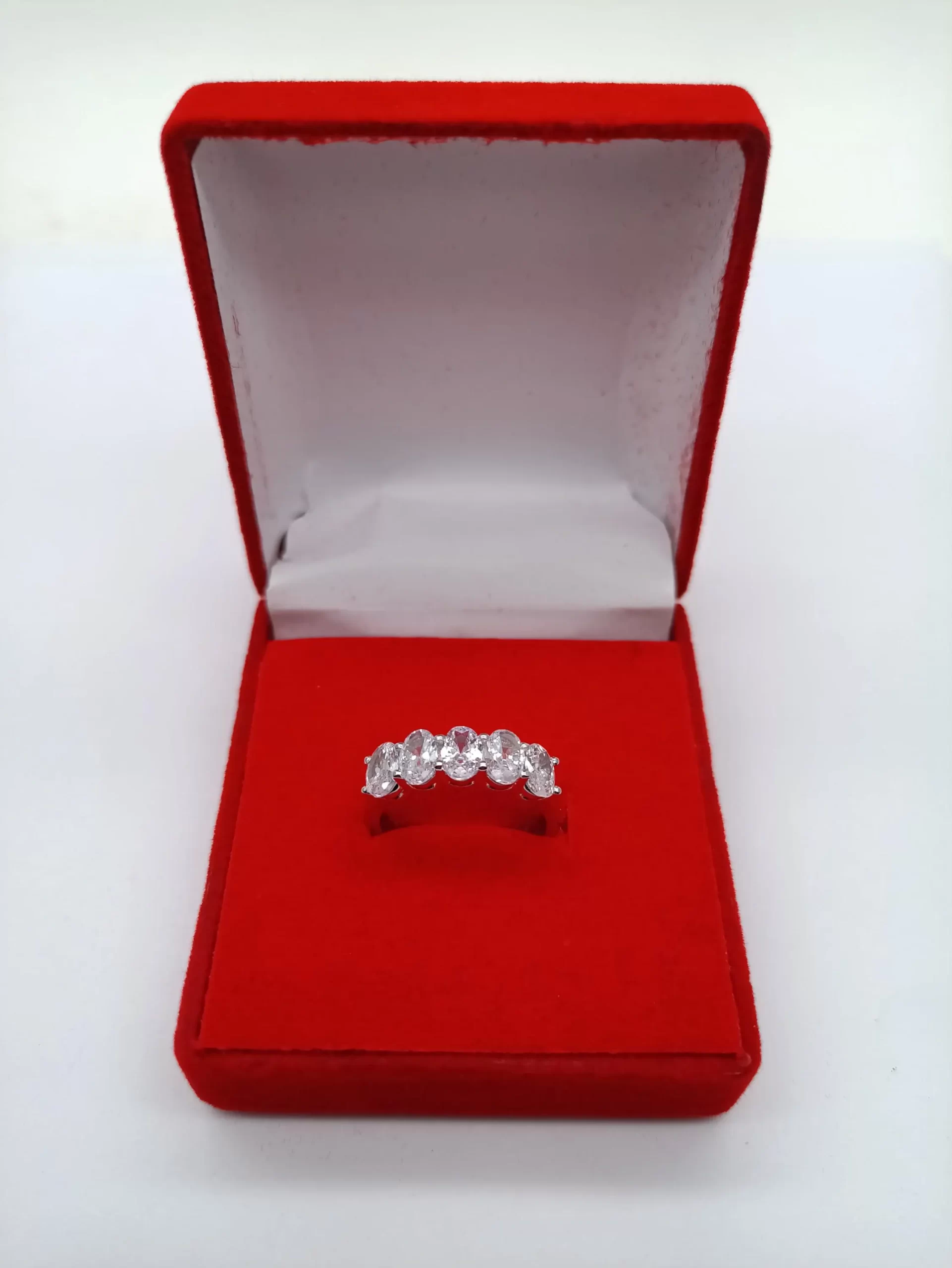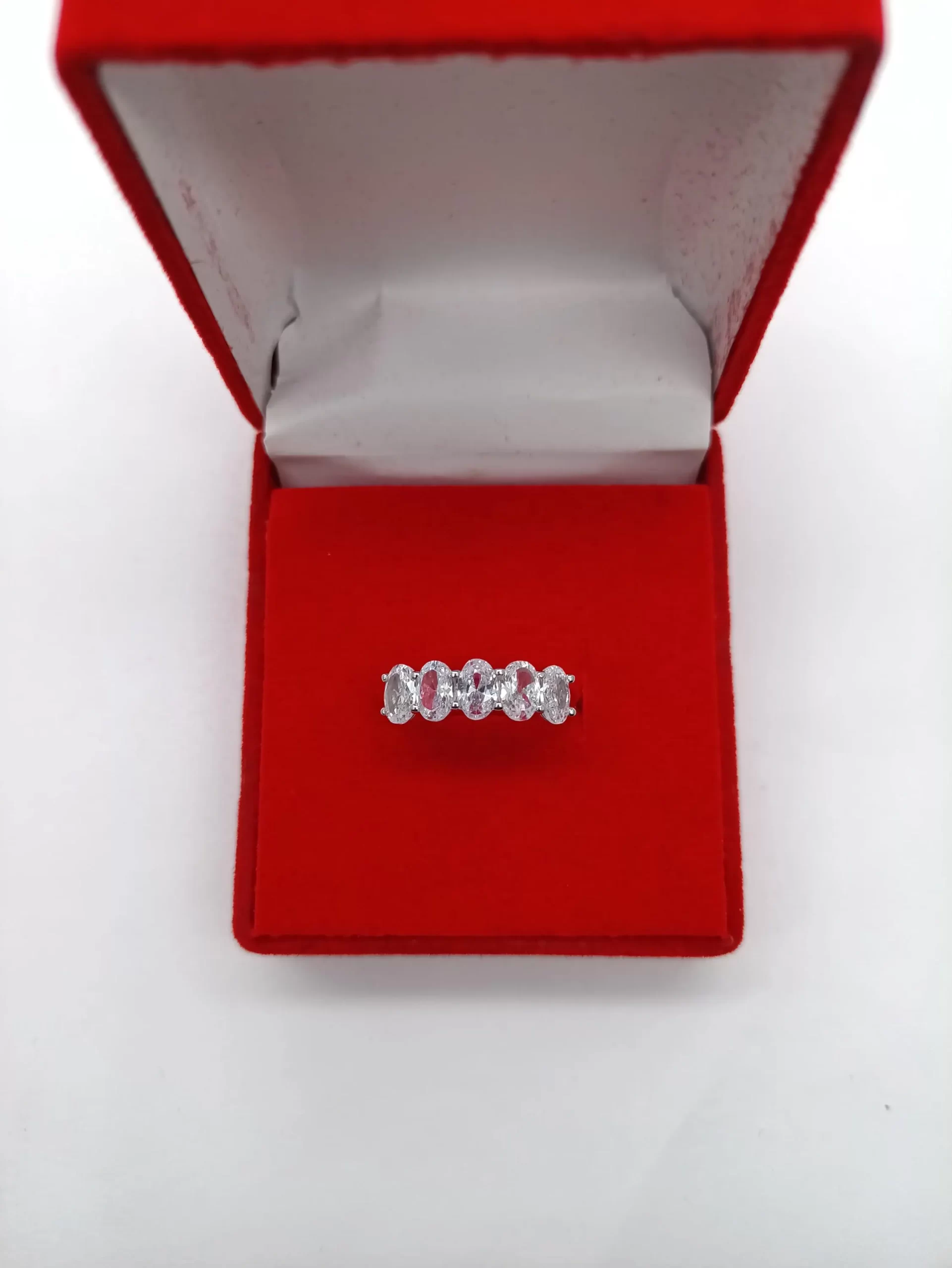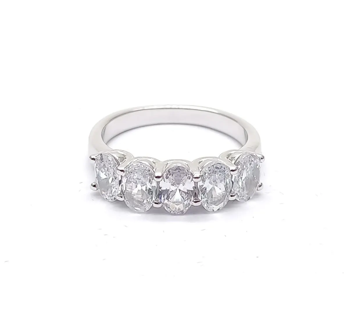 Make a timeless statement with this Oval Cut Five-Diamond Sterling Silver Engagement Ring, beautifully 14K white gold-plated for a luxurious finish. Featuring five dazzling oval-cut stones, this ring symbolizes everlasting love and elegance. Crafted from high-quality sterling silver, this piece offers brilliance, durability, and comfort, making it perfect for both daily wear and special occasions.