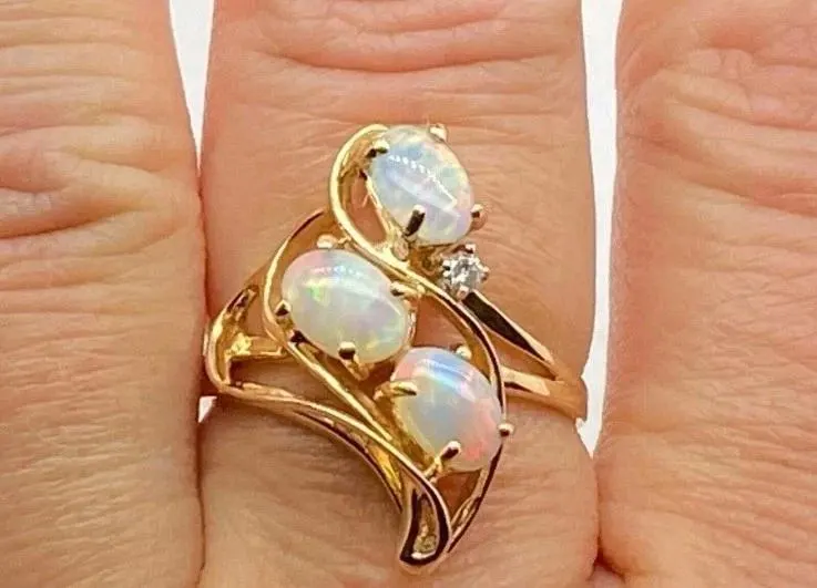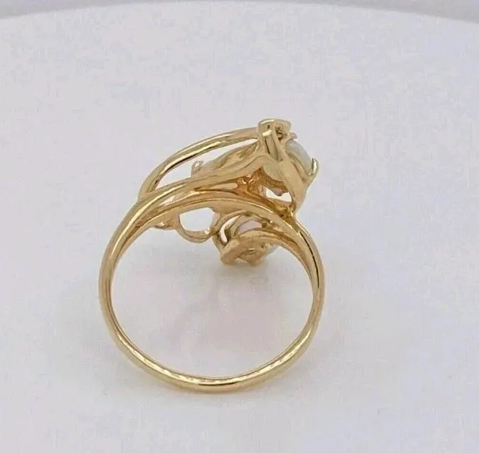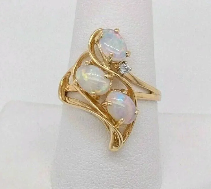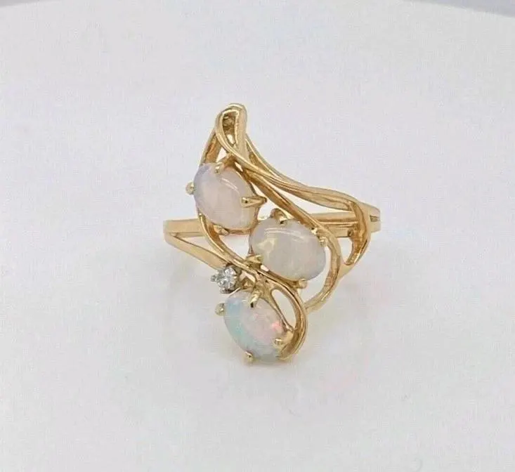 This elegant ring features three simulated opal cabochons and a sparkling cubic zirconia accent, all set in genuine sterling silver with rich 14K yellow gold plating. The flowing openwork design adds a vintage-inspired look, making it a standout accessory for everyday wear or special occasions. Perfect for those who love the beauty of opals and diamonds.